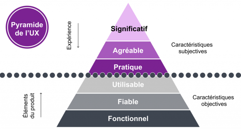 La pyramide de l’UX met en évidence l’importance de répondre d’abord aux besoins fonctionnels de base, puis de progresser vers des niveaux supérieurs pour créer une expérience utilisateur complète et satisfaisante.