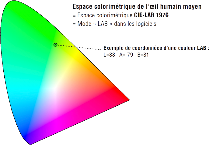 Le modèle de couleur CIE L*a*b* (Lab) repose sur la perception de la couleur par l’œil humain. Les valeurs numériques du modèle Lab décrivent toutes les couleurs perceptibles à l’œil humain. Etant donné que le modèle Lab décrit l’aspect d’une couleur plutôt que la quantité de colorant nécessaire pour la reproduire sur un périphérique donné (tel qu’un moniteur, une imprimante de bureau ou un appareil photo numérique), il est considéré comme indépendant du périphérique. Les systèmes de gestion des couleurs utilisent le modèle Lab comme référence pour transposer de manière fiable dans un autre espace colorimétrique une couleur d’un espace colorimétrique donné.